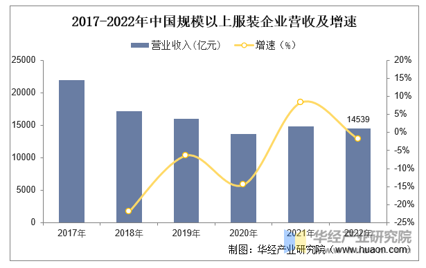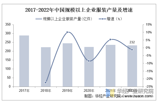 从出产量来看,2022年中国规模以上企业服拆产量为232亿件,同比下降3。3%,降幅比上半年扩大1。88个百分点,比2021岁尾下滑11。74个百分点。