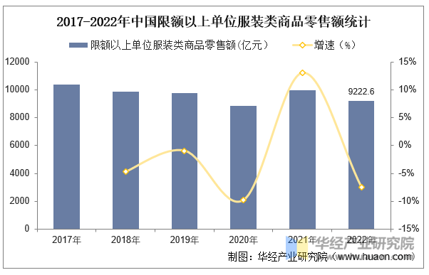 按照国度统计局数据,2022年的中国限额以上单元服拆类商品零售额全年累计值为9222。6亿元,同比下降7。7%,增速较2021岁尾下滑21。9个百分点。
