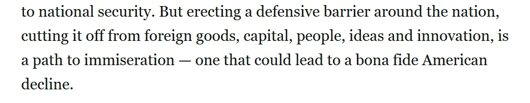 文章最初征引业内人士的话说,美国若是建起全面防御壁垒,堵截商品、本钱、人才及立异的国际流动,终将经济阑珊,这或将实正导致美国式微。