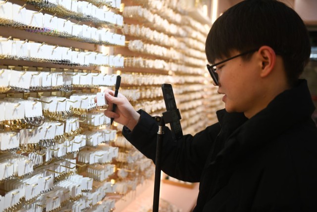 2月9日,义乌国际商贸城的一家饰品店肆工做人员通过手机曲播平台发卖产物。记者 黄治 摄。