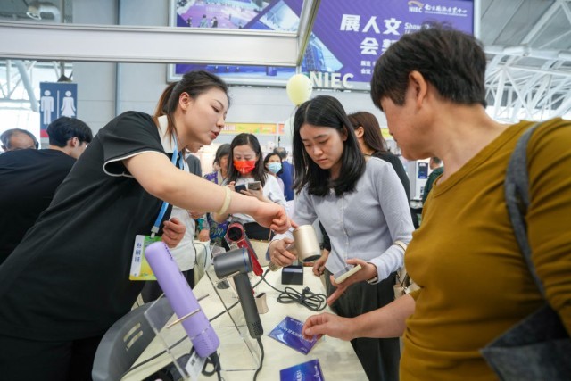 4月19日,工做人员正在勾当现场引见吹风机产物。当日,2025年“外贸优品中华行江苏坐”首场勾当正在江苏南京国际展览核心举行。记者 李博 摄!