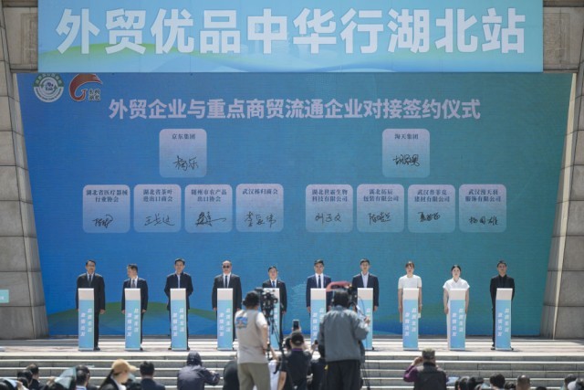 4月26日正在启动典礼现场拍摄的外贸企业取沉点商贸畅通企业对接签约典礼。外贸优品中华行湖北坐暨“乐购湖北”消费季勾当正在武汉市汉口北国际商业城启动。记者 伍志卑 摄。